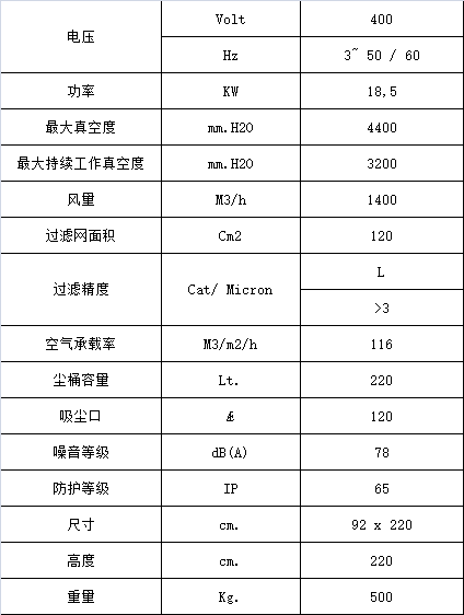 吸塵系統是旁路馬達,由風扇和馬達軸直聯而成,無傳輸裝置,因此完全免維修,適應于24小時高強度作業,操作時噪音低,性能優 。當機器過熱時會自動切斷電源,停止工作。控制板設在機器的后面,有ON和OFF開關(IP65),一個緊急關閉開關和軟開啟按鈕。真空指示器會不停地監視吸塵過程,避免堵塞或異常。同時泄壓閥保護馬達避免因濾袋堵塞或其他吸塵系統的破損而造成的過熱。出風口處的濾袋減少流出氣體的噪音并達到降速。配備遠程遙控開關,便于集塵系統高效開始/關閉。